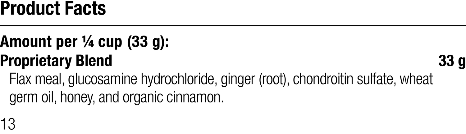Flax meal, glucosamine hydrochloride, ginger (root), chondroitin sulfate, wheat germ oil, honey, and organic cinnamon.