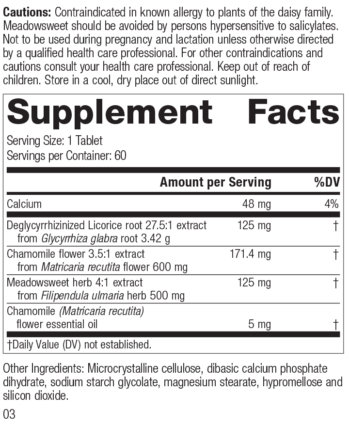 Each Serving Size (1 Tablet) contains: Calcium 48 mg, Deglycyrrhizinized Licorice root 27.5:1 extract 125 mg (from Glycyrrhiza glabra root 3.42 g), Chamomile flower 3.5:1 extract 171.4 mg (from Matricaria recutita flower 600 mg), Meadowsweet herb 4:1 extract 125 mg (from Filipendula ulmaria herb 500 mg), Chamomile (Matricaria recutita) flower essential oil 5 mg. Other Ingredients: Microcrystalline cellulose, dibasic calcium phosphate dihydrate, sodium starch glycolate, magnesium stearate, hypromellose and silicon dioxide.